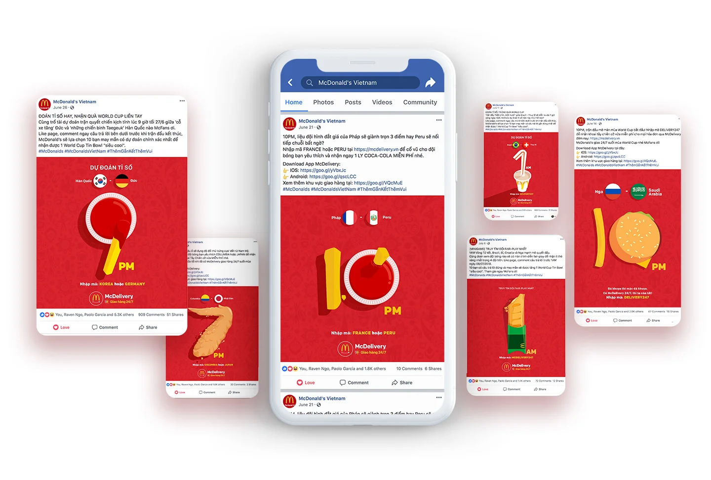 These game time reminders were displayed around McDonald’s stores in Ho Chi Minh City and thru Facebook targeted link ads which drove them to the McDelivery app with precision marketing deployment. The posters and posts were updated in real-time to promote different matches during different days. This made the idea continuously relevant to football fans throughout the whole tournament.